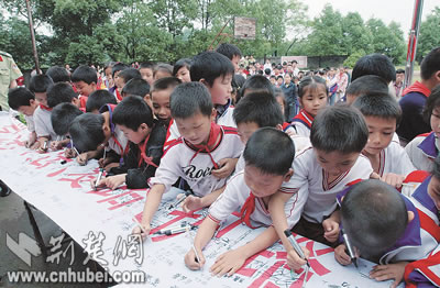 圖為鄂州市桐城小學學生踴躍簽名爭做遵守交通法規(guī)好學生。