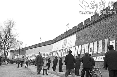 荊楚網(楚天都市報)(記者釋喻 攝)前日上午,襄樊西門橋古城墻上舉辦了一場別開生面的書法展,近百幅作品被懸掛在城墻上,向市民免費展出,展覽為期7天。此次活動由襄樊市文聯等單位舉辦,展出的是書法家王樹人先生的遺作和其傳人的近期作品;顒蝇F場還進行了書法義賣,所得款項將用于襄樊歷史文化名城的保護和宣傳工作。