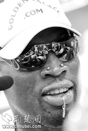 荊楚網(wǎng)消息(楚天都市報)(記者門天清 實習生周玥廷 金天)昨日中午,有著8年NBA職業(yè)球員生涯,并擁有6枚NBA總冠軍戒指的前NBA巨星羅德曼一行從上海飛抵武漢,他將參加于今晚在漢舉行的“2005美國前NBA巨星王朝中國巡演”第一站的比賽。