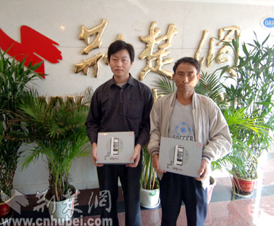 荊楚網(wǎng)24日訊 記者艾丹 潘頔 報道:23日抽出的“讀報紙、發(fā)短信、中手機”活動的兩位幸運獲獎?wù)撸錆h的李先生和谷城的孟先生,今天下午來到荊楚網(wǎng)領(lǐng)獎,荊楚網(wǎng)總編輯閻思甜親自為他們頒獎。