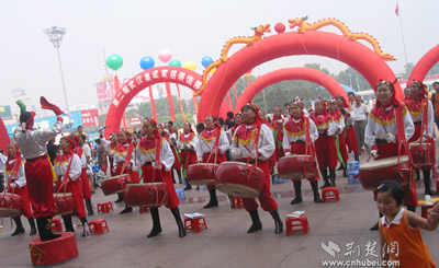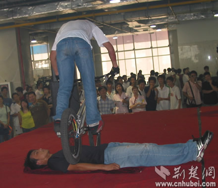 武漢市首屆時尚體育博覽會開幕式現(xiàn)場來自硚口區(qū)漢水橋街威風(fēng)鑼鼓隊在開幕式上進行精彩的表演賽車俱樂部的車手和車模亮相東方神馬騎士俱樂部漂亮神氣的女騎士健身教練在進行健身表演極限單車高手有驚無險的表演
