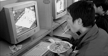 一位學(xué)生正在網(wǎng)吧玩網(wǎng)絡(luò)游戲,他坐在電腦前邊玩邊吃飯。南山攝