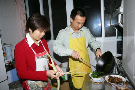 航天員費(fèi)俊龍?jiān)诩抑袔蛺?ài)人王潔炒菜,樂(lè)在其中