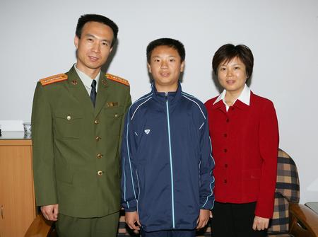 航天員費(fèi)俊龍和愛(ài)人王潔、兒子費(fèi)迪在家中合影