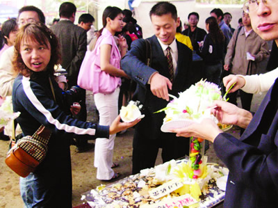 這個(gè)匠心獨(dú)運(yùn)的蛋糕由妞妞公司制作贈(zèng)送。其主體部分是一條飛龍,并書有“飛龍?jiān)谔臁弊謽。飛龍一側(cè),則是一只“神舟六號(hào)”航天飛船模型。