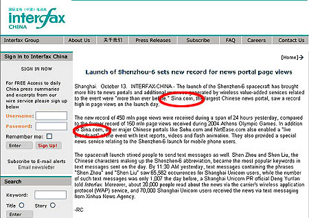 10月14日,俄羅斯國(guó)際文傳社報(bào)道神六使中國(guó)新聞門戶網(wǎng)頁(yè)面流量創(chuàng)新高。