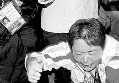 劉青的另一名教練張敏情緒激動,攔住了一名仲裁理論。記者越來越多,把倆人圍在中間。張敏不斷大聲喊叫:“我只要一個公平!”聲音逐漸嘶啞。仲裁向電梯走去,她硬扒住電梯。仲裁只能返回到競賽控制中心,但中途又被張敏擋住。她甚至哭著跪倒在地,幾乎暈厥(如圖)。
