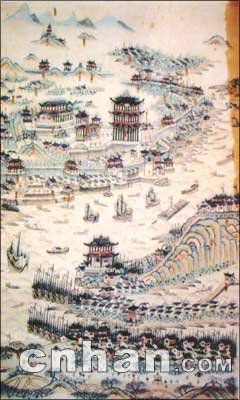 此圖藏于大連市圖書館,手繪彩圖。未標明作者姓名和成圖時間,圖中標注了武昌、漢口“龍王廟”等。筆者鑒定此圖為清代中期作品,根據(jù)是圖中有“龍王廟”,而龍王齋建于乾隆四年(1739年),故此圖當于1739年以后所繪。但圖中沒有出現(xiàn)漢口城堡,而漢口城堡建于1864年,同時圖中只繪有木帆船,而未出現(xiàn)現(xiàn)近代輪船。武漢江面出現(xiàn)航運和輪船是1862年以后?芍藞D當成于1862年前。可大體界定此圖繪于1739年至1862年之間。