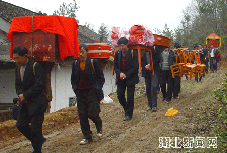 今年1月,該縣文化部門在采花鄉(xiāng)找到完整的“唐祭儀式”藝人班子。十幾名藝人雖然在解放后都沒有再進(jìn)行過“告祖”儀式,但整個(gè)程序記得十分清楚。經(jīng)協(xié)商策劃,決定利用男女雙方實(shí)景把“告祖”及土家婚俗完整真實(shí)拍攝下來。3月28日,市縣兩級(jí)文化工作專班和十六名民間藝人開赴傅家堰火山村,日夜奮戰(zhàn)4天,終于把“告祖”的整個(gè)程序以寫實(shí)手法拍攝下來。同時(shí),還拍攝到了土家婚俗中背新娘、吃雞蛋茶、抬花轎、陪十弟兄、陪十姊妹的珍貴鏡頭,把土家婚俗完整記錄了下來,為項(xiàng)目的申報(bào)工作進(jìn)一步夯實(shí)了基礎(chǔ)。
