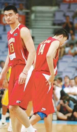 第二節(jié)還有9分13秒時,姚明上場,明郅組合終于出現(xiàn)。姚明打內(nèi)線,王治郅打外線,兩人難有很好配合。巴西隊以44比38結(jié)束上半場。