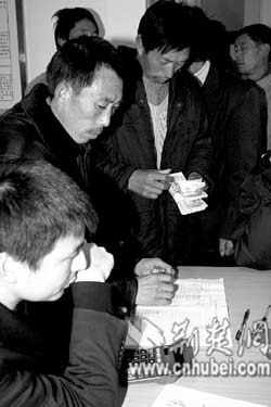 荊門麻城鎮(zhèn)譚珍國等農(nóng)民工,在天門市勞動保障監(jiān)察大隊(duì)領(lǐng)取用人單位所欠的工資款(上圖)。去年12月以來,天門市組織有關(guān)職能部門對全市37家用人單位支付農(nóng)民工工資情況進(jìn)行專項(xiàng)檢查,共查出6家用人單位拖欠農(nóng)民工工資,他們及時(shí)為2056名農(nóng)民工追回工資180余萬元(下圖)。(特約記者肖金舫通訊員劉銀斌攝)