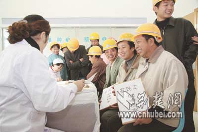 昨日和他一起接受免費(fèi)體檢的,還有另外在百步亭從事建設(shè)的400多名農(nóng)民工。