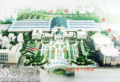 漢口火車站將建設南北兩個廣場。面積分別為9.24公頃、3公頃。配套道路包括,打通車站東側金墩路,下穿鐵路線后連通北廣場,向北延伸至常青一路、紅旗渠路等;發(fā)展大道改為下穿隧道;西側建設下穿鐵路的銀墩路,連通北廣場。站前廣場西側布置地鐵2號線漢口火車站站,以及公交樞紐站等。據(jù)估算,整個市政配套工程總投資約14億元,計劃2008年6月完成。