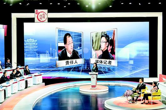 圖為:電視問政直播現(xiàn)場(chǎng),媒體記者向相關(guān)責(zé)任人提問。(湖北日?qǐng)?bào)全媒記者 倪娜 攝)