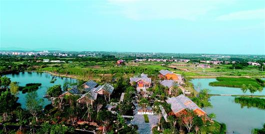 圖為:空中俯瞰桃花驛生態(tài)度假區(qū),碧水藍(lán)天風(fēng)景宜人。(視界網(wǎng) 方柳 攝)
