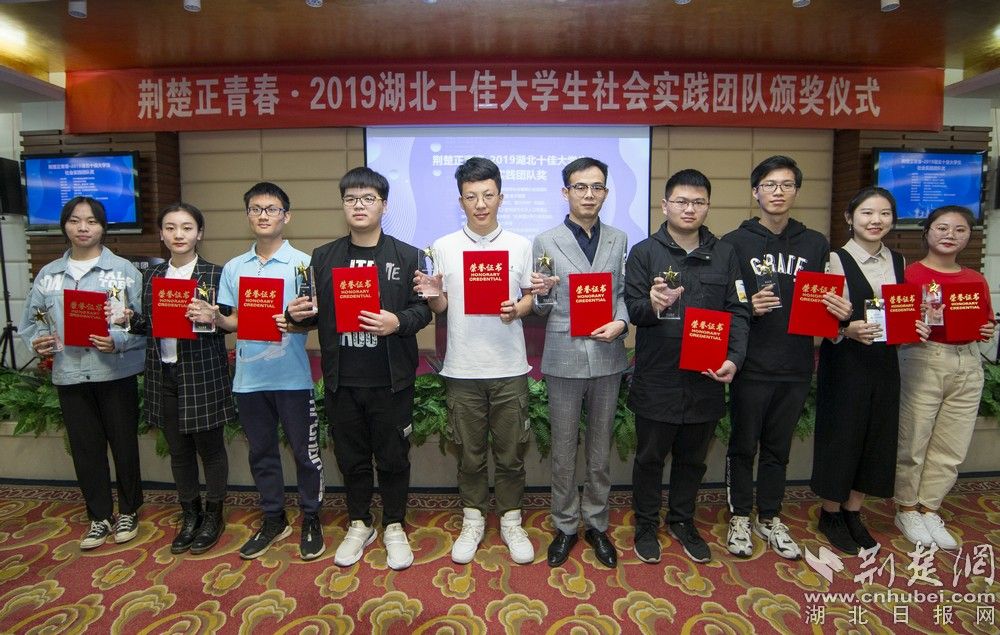 荊楚網(wǎng)客戶端—荊楚網(wǎng)消息(湖北日報大學(xué)生記者王霞 陳醒 李沁園 周楚鈞)11月9日,由荊楚網(wǎng)(湖北日報網(wǎng))主辦的“荊楚正青春?2019湖北十佳大學(xué)生社會實踐團(tuán)隊”頒獎儀式舉行,現(xiàn)場頒發(fā)了2019湖北十佳大學(xué)生社會實踐團(tuán)隊、2019湖北大學(xué)生社會實踐報告優(yōu)勝獎、2019湖北大學(xué)生社會實踐優(yōu)秀組織獎,共20名。