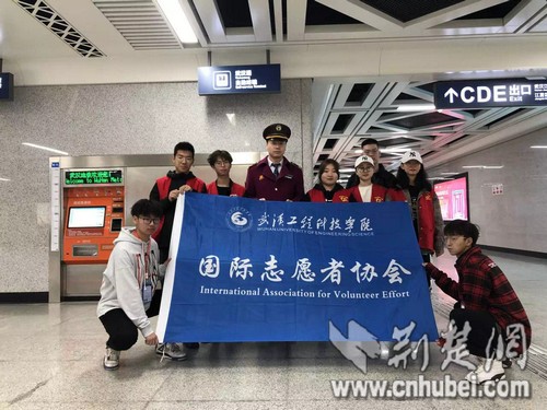 武漢工程科技學(xué)院團(tuán)委學(xué)生會國際青年志愿者協(xié)會在武漢地鐵進(jìn)行志愿服務(wù)。張耀辰 陳垚 攝