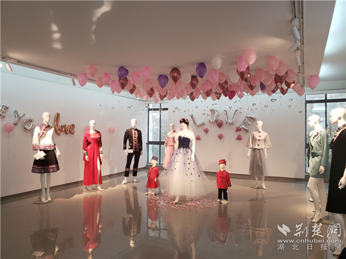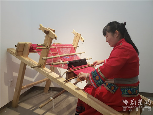 荊楚網(wǎng)客戶端-荊楚網(wǎng)消息(湖北日報(bào)大學(xué)生記者 張含笑)12月16日,在中南民族大學(xué)美術(shù)館展廳內(nèi),陳列著一個極具民族風(fēng)情的婚禮現(xiàn)場,新娘的紗裙、花童的服飾、伴娘的衣扣、主持人的腕套等等 ,均采用了恩施土家族苗族自治州的國家級非物質(zhì)文化遺產(chǎn)土家織錦 “西蘭卡普”,顏色艷麗,造型美觀,很是新穎。