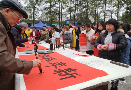 當(dāng)天現(xiàn)場(chǎng)人氣最高的要數(shù)“送春聯(lián)”了。該校皮永和、王海濤、左世耀三位老師早早便來(lái)到現(xiàn)場(chǎng)書(shū)寫(xiě)春聯(lián),一連幾個(gè)小時(shí)都沒(méi)有歇息?!袄蠋焸儗?xiě)的字蒼勁有力,我很喜歡。”2019級(jí)經(jīng)濟(jì)學(xué)專業(yè)的王羨排了很長(zhǎng)的隊(duì)才領(lǐng)到心儀的春聯(lián),滿意地說(shuō),“馬上過(guò)年啦,我正好可以貼在寢室門(mén)口,很應(yīng)景!”
