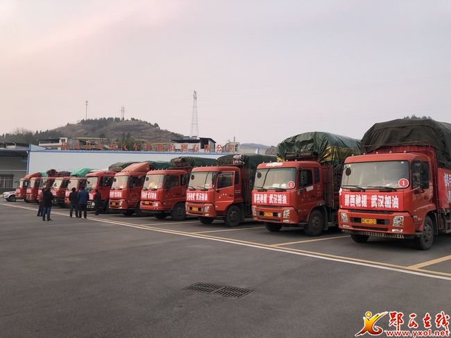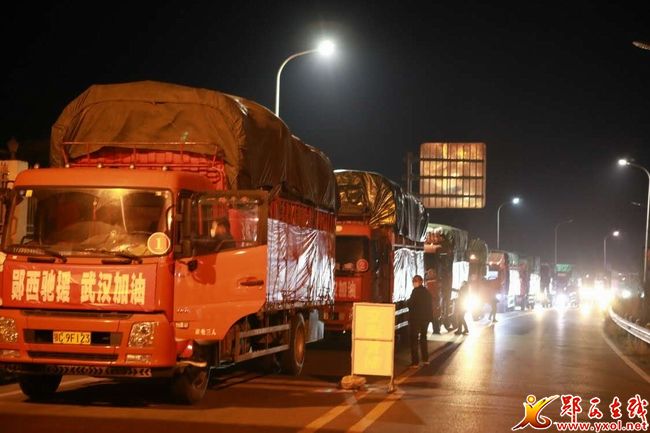 3月6日早上6點30分, 鄖西縣支援湖北省武漢市愛心捐贈物資車輛啟程向武漢方向行駛。11輛大卡車車廂上,一條條暖心的橫幅格外引人注目。