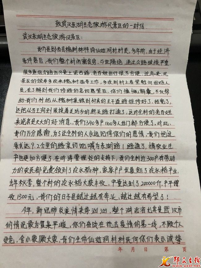 信中大意是,以前村里不通路,農(nóng)產(chǎn)品賣不出去,你們慷慨解囊扶持我們打通了出山路以后, 全村300多戶有勞動能力的村民開始利用獨特的冷水資源種植生態(tài)有機水稻,戶坪增收1500多元,村民都愿意與武漢市一起度過難關(guān)……