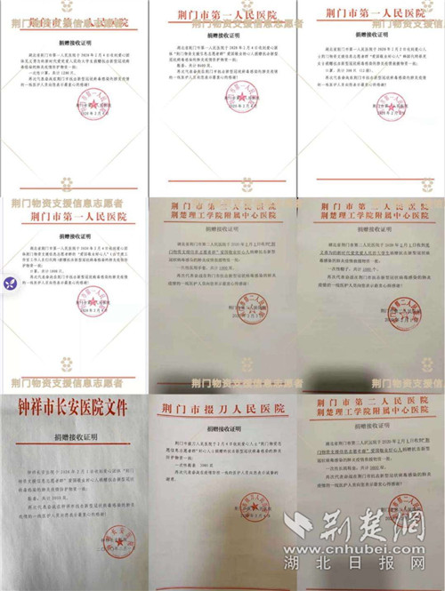 在張心怡的努力下,已通過各方渠道為荊門市第一人民醫(yī)院等八家荊門當(dāng)?shù)蒯t(yī)院購買防護(hù)服、醫(yī)用口罩、長筒厚鞋套、消毒泡騰片、水果蔬菜等防疫物資和生活物資,幫助醫(yī)院解決燃眉之急。