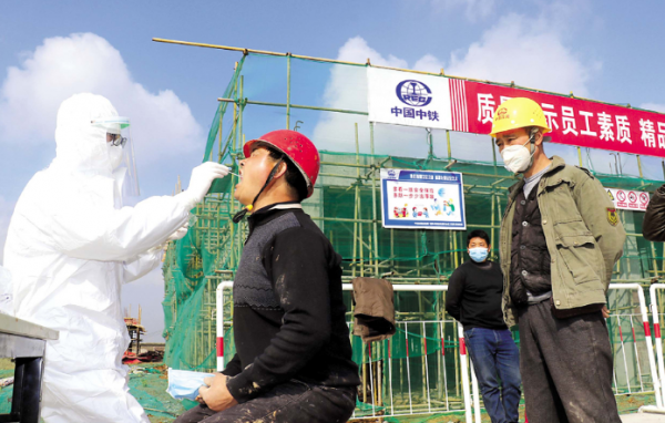 3月30日,中鐵四局市政公司荊門國際內(nèi)陸港鐵路作業(yè)區(qū)項目部請掇刀區(qū)麻城鎮(zhèn)衛(wèi)生院醫(yī)護人員到工地為返崗農(nóng)民工進行核酸檢測。據(jù)了解,該項目部一手抓疫情防控,一手抓有序復(fù)工,采取“點對點”包車方式接員工返崗,進行防疫知識宣講,配備防疫物資,對辦公場所、食堂、宿舍進行消毒,保證復(fù)工安全。記者 朱舜 通訊員 王鵬 攝