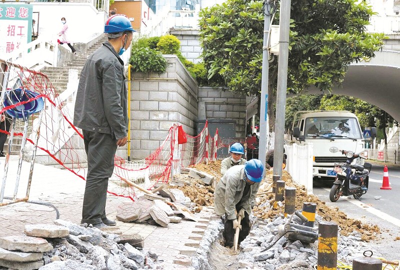 4月13日,施工人員正在對(duì)鄖陽(yáng)區(qū)城關(guān)鎮(zhèn)金沙路破損或松動(dòng)的人行道磚進(jìn)行修復(fù)。4月以來(lái),在鄖陽(yáng)區(qū)創(chuàng)文辦的統(tǒng)一安排部署下,該區(qū)住建部門(mén)成立市政維修專(zhuān)班,重點(diǎn)對(duì)城區(qū)各主次干道的道牙石、人行道磚破損、松動(dòng)、凹陷等進(jìn)行全面排查和修復(fù),方便市民出行,預(yù)計(jì)4月底完工。