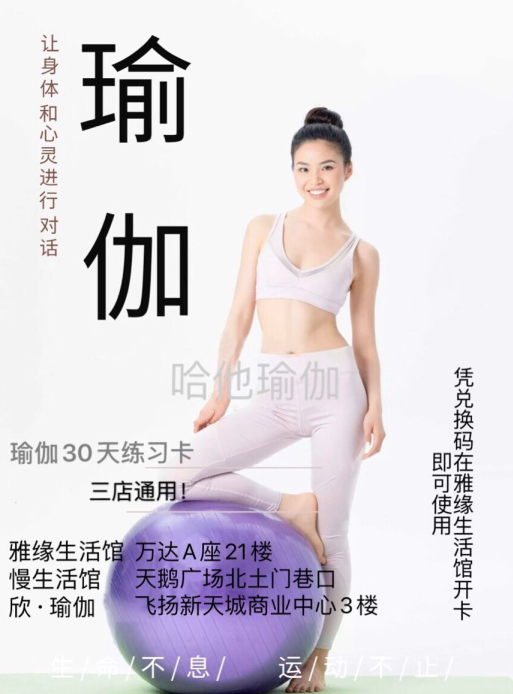 荊門市瑜伽協(xié)會會員單位:雅緣生活館、慢生活館、欣·瑜伽三店通用瑜伽30天練習(xí)卡,打造荊城美麗俏佳人。制造美麗、傳遞快樂,生命不息,運動不止。