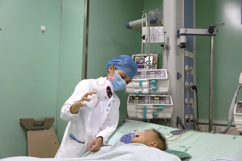 在PICU,醫(yī)護人員精心照看佳佳,不時用玩具逗她開心。