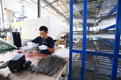 14日,通山縣經(jīng)濟(jì)開發(fā)區(qū)低碳產(chǎn)業(yè)園創(chuàng)盛光學(xué)有限公司,工人在眼鏡鏡片生產(chǎn)線上作業(yè)。