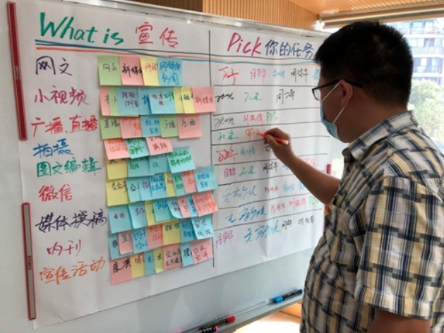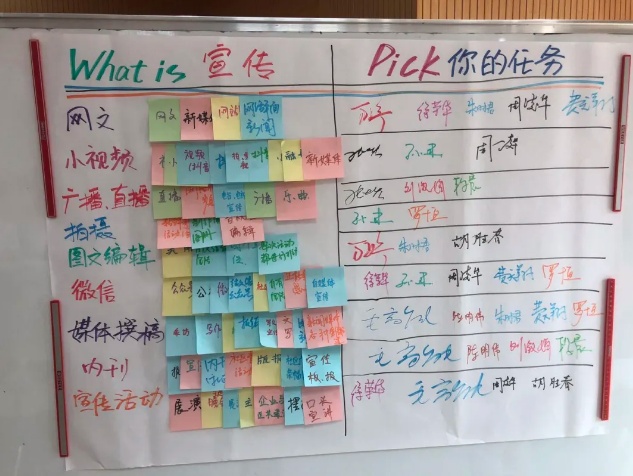 會議設(shè)計了一個有趣的互動環(huán)節(jié),每人發(fā)了五張貼紙,頭腦風(fēng)暴,寫出你心中認(rèn)為可以開展宣傳工作的五個方向,然后分類貼到白板上。經(jīng)過歸納總結(jié),找到了以下答案:可以通過網(wǎng)文、小視頻、廣播、直播、微信公眾號、內(nèi)刊等開展媒體宣傳,通過地攤、展演、演唱會等開展現(xiàn)場活動宣傳。