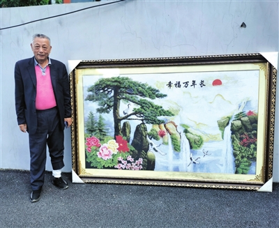 據(jù)金開珠介紹,這幅《幸福萬年長》十字繡長達3米,高達2米,由老伴王晚珍手工繡制而成。本有一位老板想以15萬元的價格收購,但因為自己和老伴的身體原因,十字繡花了三年多時間才繡好,老板等不了那么久另尋他人購買了,所以十字繡至今還沒有賣出去。