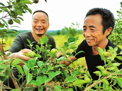 9月10日,崇陽縣石城鎮(zhèn)漢興村村民楊四雄(右)在油茶基地查看油茶長勢。