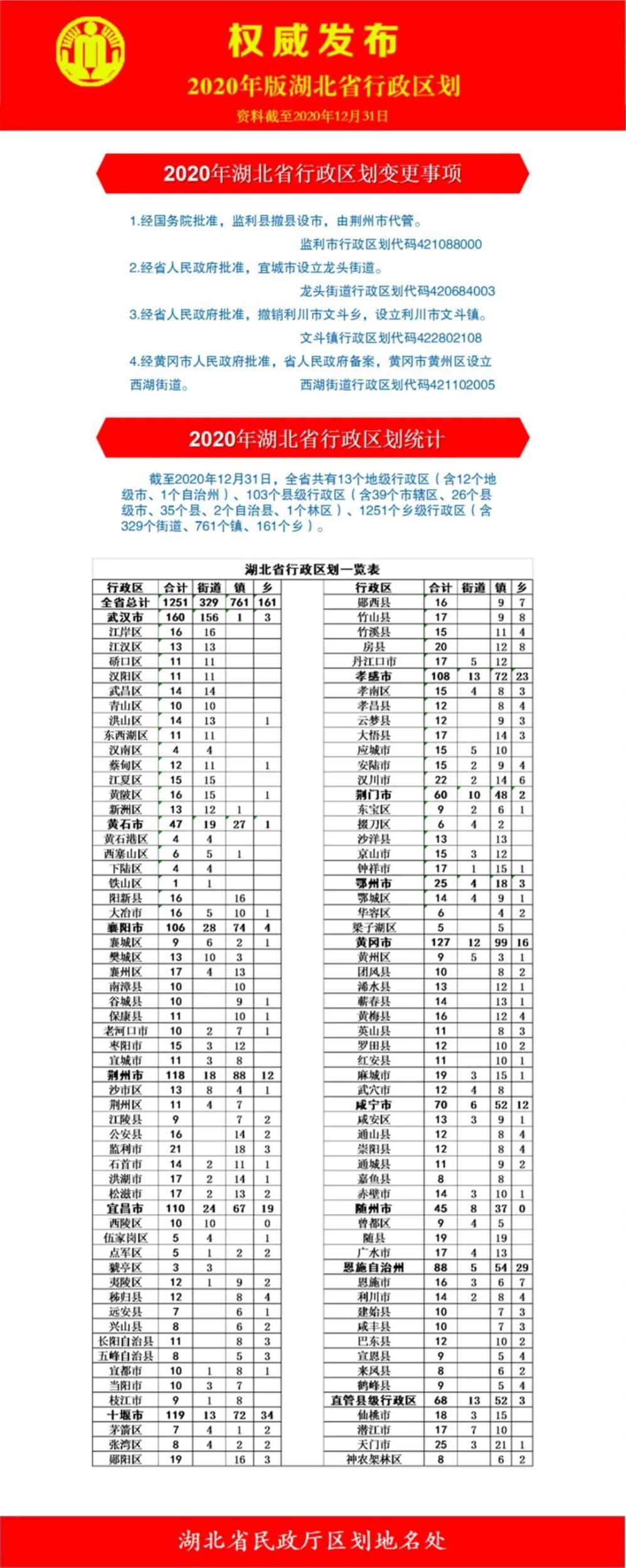 近日,湖北省民政廳公布了湖北省最新行政區(qū)劃。