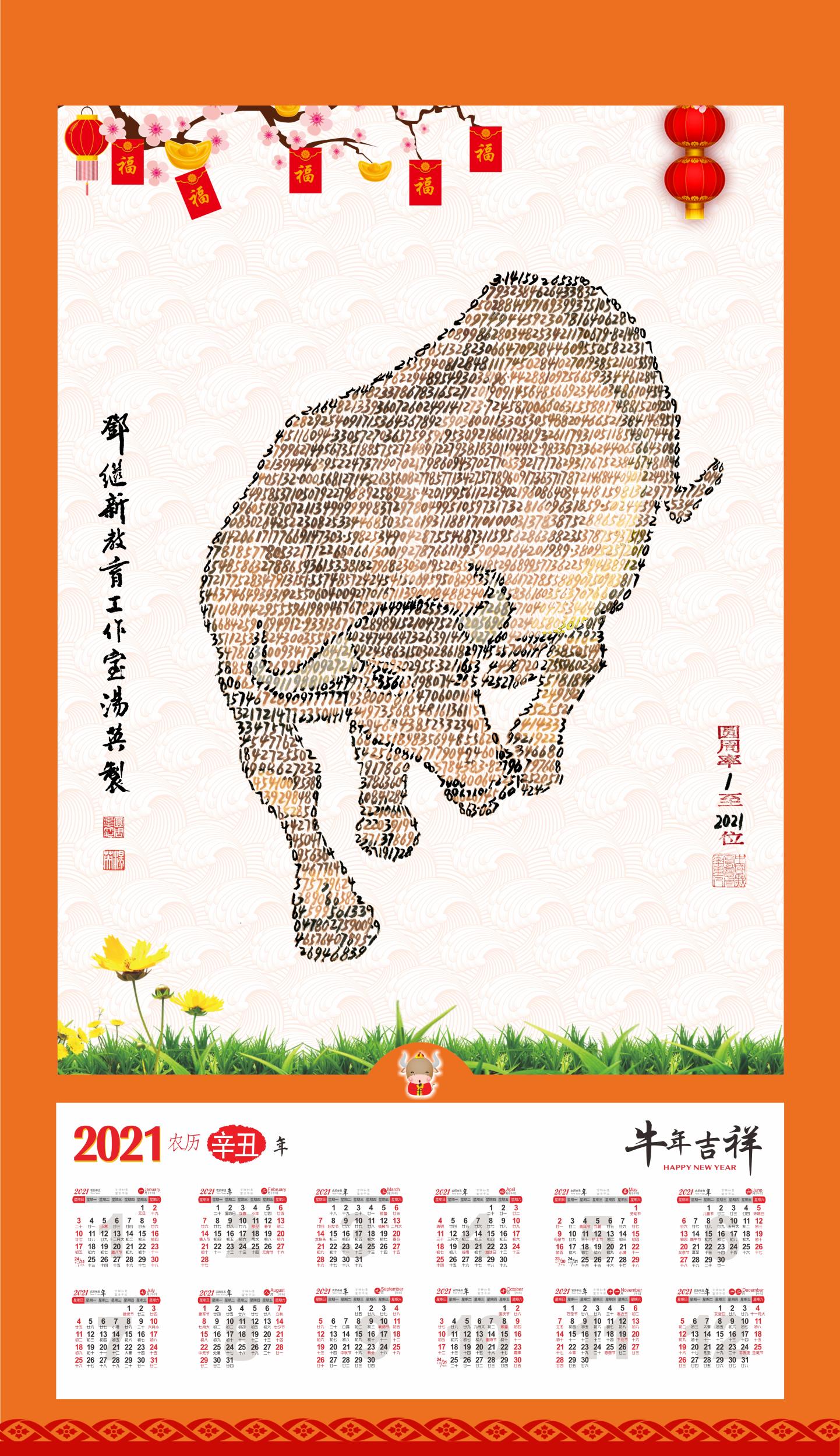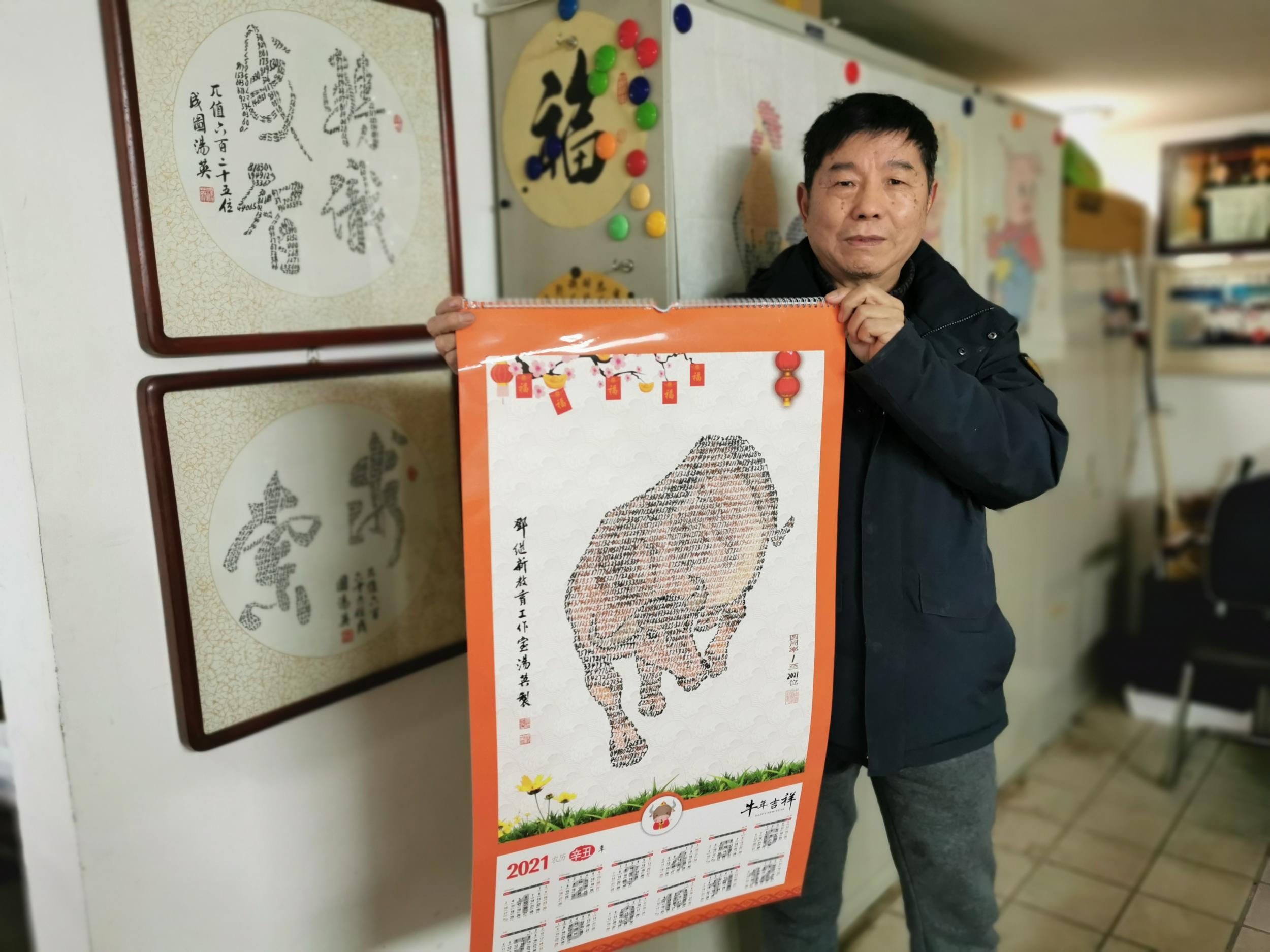 荊州新聞網(wǎng)消息:2021年恰是辛丑牛年。近日,世界記憶奇人、圓周率構(gòu)成藝術(shù)創(chuàng)始人湯英先生,第五年續(xù)寫新作,再次創(chuàng)作出圓周率書畫新年掛歷——《勁牛奮蹄》,這是他繼2017年、2018年、2019年、2020年分別創(chuàng)作出圓周率書畫掛歷《雞年大吉》、《旺狗賀歲》、《福豬獻寶》、《金鼠送?!分蟮挠忠簧ぜ炎?,再次向世界展示圓周率數(shù)字藝術(shù)的神奇魅力。
