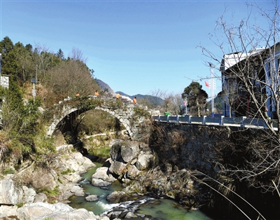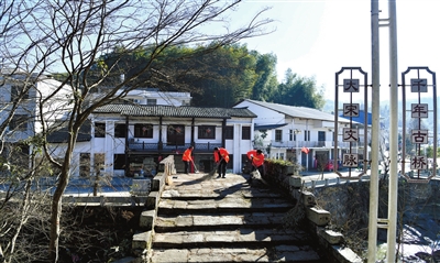 村民志愿者清掃宋代古橋上落葉