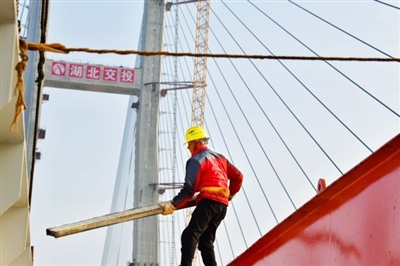 來自鄂州的胡榮鵬是大橋中跨鋼主梁吊裝班的班長,吃完中午飯,他和工友們便早早地來到施工作業(yè)面,開始吊裝鋼橫梁。