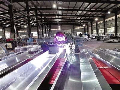 在中港金屬制造有限公司車間外,一輛加長貨車正在裝運送往武漢的成品。車間里,焊花飛濺,工人們正在熟練地完成原材料開料、折彎、焊接、拋光等工序。