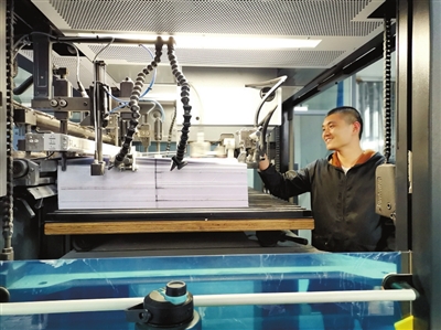 3月3日,記者在山河文化發(fā)展有限公司看到,車間里機聲隆隆。在一個大型流水機器旁,一名員工專注地放紙,隨后機械打印、切割、檢驗、裝訂成書……人機配合十分默契。