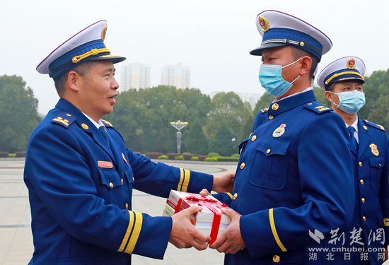 支隊負責人為指戰(zhàn)員代表發(fā)放黨史學習書籍。通訊員供圖