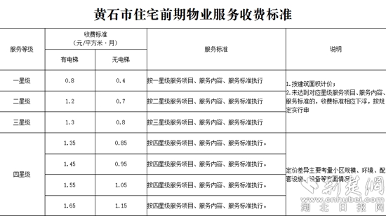 黃石市住宅前期物業(yè)服務(wù)收費(fèi)標(biāo)準(zhǔn)。來源:黃石市發(fā)改委官網(wǎng)