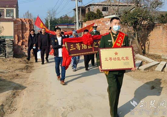 “送喜報(bào)的來啦!”隨著一陣陣鞭炮聲和鑼鼓聲,河南省鄲城縣寧平鎮(zhèn)的李民高興地合不攏嘴。原來,他的兒子李儒因在部隊(duì)表現(xiàn)突出榮立三等功。在李儒的老家,一塊“三等功臣之家”的牌匾穿街走巷,格外醒目。村民們自發(fā)組織起鑼鼓隊(duì),李儒肩上掛著“一人立功、全家光榮”的紅綢帶,和家人在村口迎接立功喜報(bào),全家人手捧立功喜報(bào)、證書、獎?wù)滦腋5刈咴诟咐相l(xiāng)親面前。
