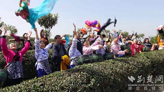 百余名武漢老知青、文藝工作者齊聚茶場,他們頌黨恩、賞春景、走茶園,邊采茶邊歌唱《沒有共產(chǎn)黨就沒有新中國》、《唱支山歌給黨聽》、《歌唱我的祖國》,載歌載舞,喜迎黨的百年華誕。