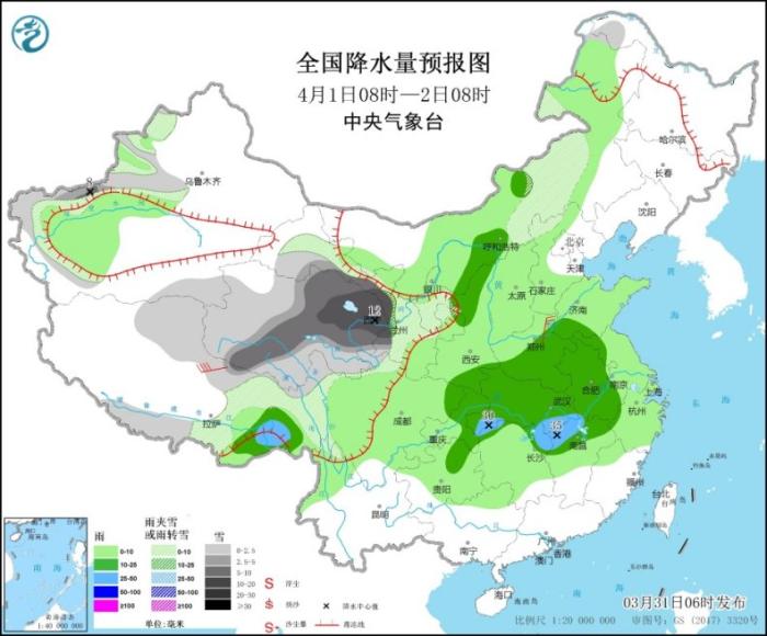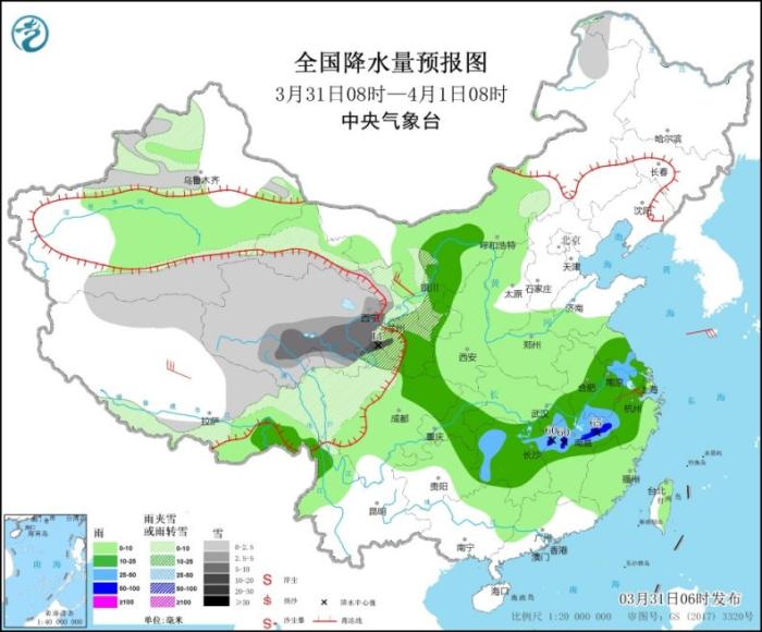3月31日08時(shí)至4月1日08時(shí),新疆北疆西部和南疆南部、西藏北部、西北地區(qū)中部、甘肅南部等地部分地區(qū)有小到中雪或雨夾雪,局地有大到暴雪(10~11毫米)。內(nèi)蒙古中西部、西藏東南部、西北地區(qū)東南部、江淮大部、江漢東部、江南北部和西部、西南地區(qū)東北部等地部分地區(qū)有中到大雨,其中,江西北部、浙江西南部等地部分地區(qū)局地有暴雨(50~65毫米)。內(nèi)蒙古西北部、西藏中部、浙江北部等地部分地區(qū)有4~6級(jí)風(fēng)。