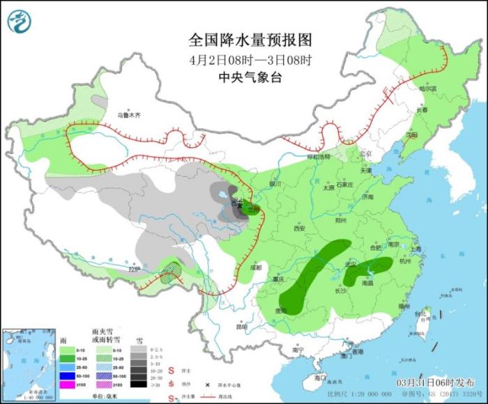 全國(guó)降水量預(yù)報(bào)圖(3月31日08時(shí)-4月1日08時(shí))