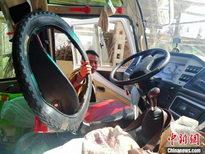 鄧蘭舟正在從車上取下幫村民帶回的輪胎(資料圖) 王登府 攝