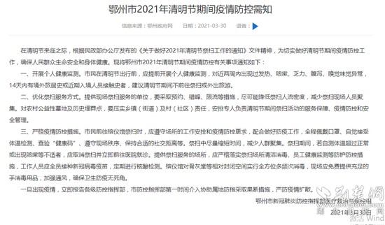 荊楚網(wǎng)(湖北日報網(wǎng))訊(記者 熊子璇)3月30日,鄂州市新冠肺炎防控指揮部醫(yī)療救治與疾控組下發(fā)《關于做好2021年清明節(jié)祭掃工作的通知》,就統(tǒng)籌做好清明祭掃與疫情防控工作做出部署安排。
