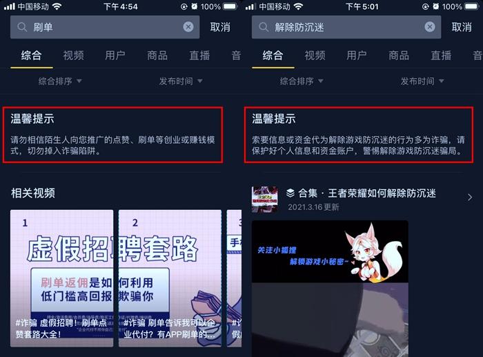 另外,抖音還上線了搜索反欺詐提示功能,用戶在抖音瀏覽或搜索“代理退?!薄ⅰ巴顿Y理財”等方面內(nèi)容時,會收到防詐反詐溫馨提示。報告顯示,2020年抖音搜索安全提示詞展示量超過了3624萬次,涉及兼職刷單、信貸理財、寵粉以及解鎖防沉迷等防詐溫馨提示展示量超過2834萬次。
