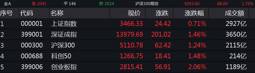 截至收盤(pán),滬指報(bào)3466.33點(diǎn),漲幅0.71%,成交額2926.52億元;深成指報(bào)13979.69點(diǎn),漲幅1.46%,成交額3650.21億元;創(chuàng)業(yè)板指報(bào)2815.41點(diǎn),漲幅2.06%;上證50指數(shù)報(bào)3582.65點(diǎn),漲幅1.22%。